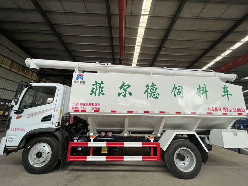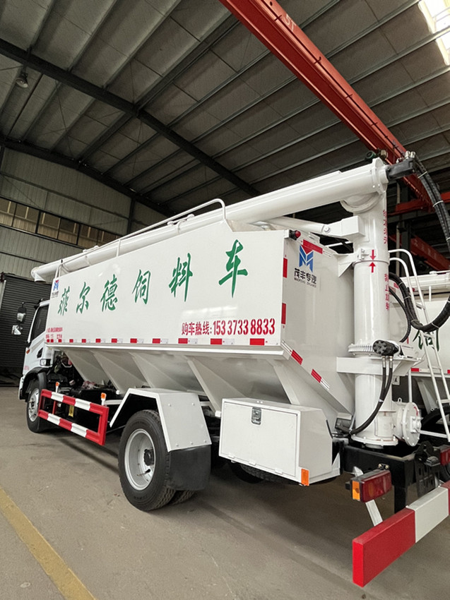 散裝飼料運輸車,散裝飼料車的飼料罐架設在卡車的底盤上,罐頂開有進料口.頂部的一根螺旋輸送卸料管(俗稱卸料絞龍)則可自由回轉和抬升,抬升的仰角可達60度。運輸時,頂部的螺旋管平臥在罐頂;卸料時則抬起,使管端的出料口與畜禽飼養(yǎng)場貯料罐頂部的進料門相接,駕駛室內裝有操縱裝置(操縱裝置也可裝置在罐體尾部),卸料時通過車底的動力輸出軸和減速器來驅動螺旋,以完成卸料。